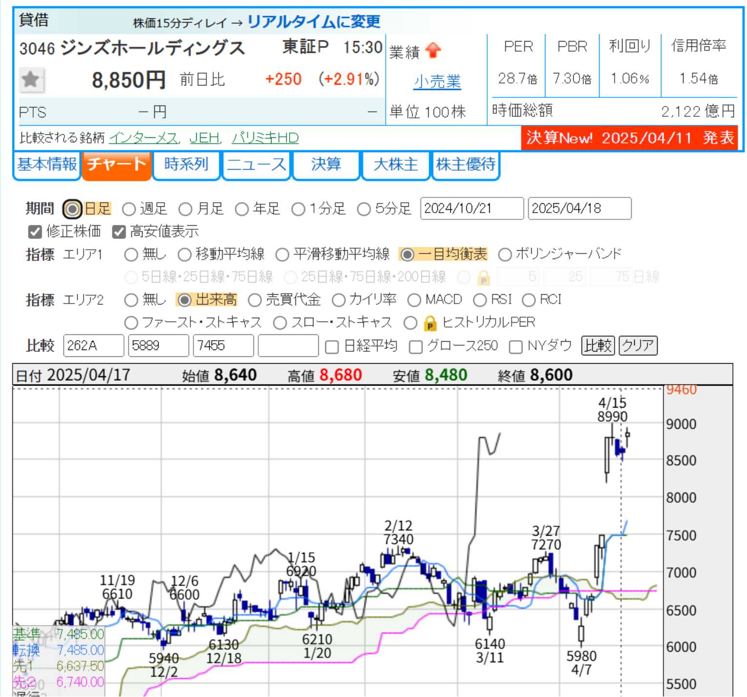 私の短期のルールで株が「吹いたら」売る。というののがある。先週の投げで買った銘柄群で、このところの戻りで「吹いた」銘柄があったので幾つか売った。よくわからないと思うので1銘柄上げると、3046ジンズホールディングを4/14に売りました。まだ上があるかもしれませんが、また短期で吹いているのでまずは現物を売りましたね。たぶん、下がってきたらまた買うと思いますが、欲張らず現金比率を高めました。予想通り全体の相場は安定してきたので、今は稼ぎ時だ。第2波がどこまでなのか、そもそも第2派なのかどうか、見極めないといけない。私はコンタクトを使っているので、優待もあるジンズホールディングは保有したいところではありますが、吹いてしまったのでいったん撤退です。メインの銘柄ではないので、こういうやり方もありかと思ってます。