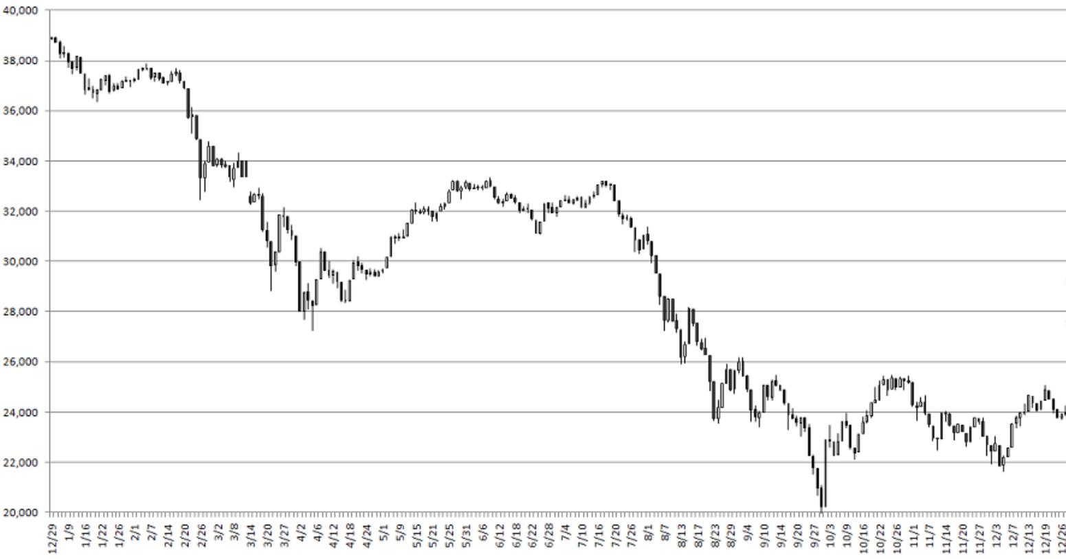 1990年の相場はチャートで分かるように年初から急落が始まり、第1波が38000円台から28000円切るとこまで一気に下がり、第2波で33000台にもどしますがそこからさらに急落して第3波で20000円まで下げるという凄まじいものでした。9か月で指数が半分というのはすごいですね。私は当時工場勤めで4直三交代をしてまして証券会社によくいってましたが、証券会社内の株価電光掲示板の前の席の人数がどんどん少なくなるのを覚えています。来ている人も目はうつろで、絶望的な顔のひともいたのを覚えています。20代前半で証券会社に出入りしているのは私一人で、株を買うわけでもない私をどうおもっていたかはわかりませんが、たぶん(変な小僧が来た)くらいに思っていたのでしょう。受付のおねえさんは優しく接してくれました。