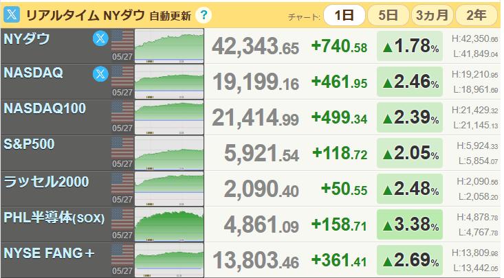 アメリカ株は貿易・関税問題の後退で2%ほどの大幅高となった。このまま高値までもどれば第2波は否定されて上昇トレンドとなり、最近の下げは押し目だったことになる。私的にはポジションを落として様子見の段階です。今日もツナギを増やしたいと思います。今年の夏は暑い動きになるのではないかな?