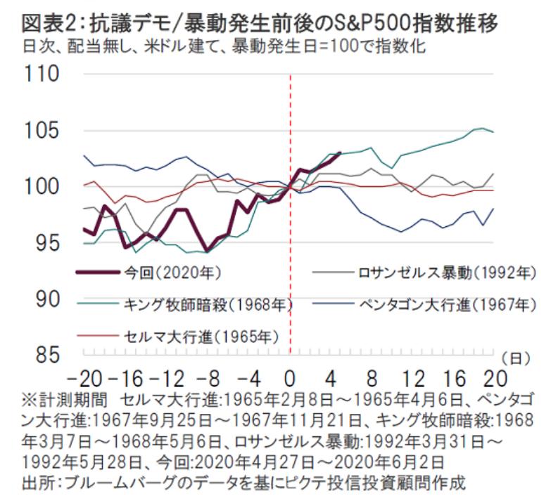 投資家の中ではこの暴動が分断社会をさらに悪化させて株価も暴落・・・なんて心配する方もいるかもしれませんが、私はそう思いません。暴動で株価が下落した記憶がないからです。とはいっても、たなぶの記憶なんかあてになりませんので、ピクテ投信がいい資料出してましたので添付します。