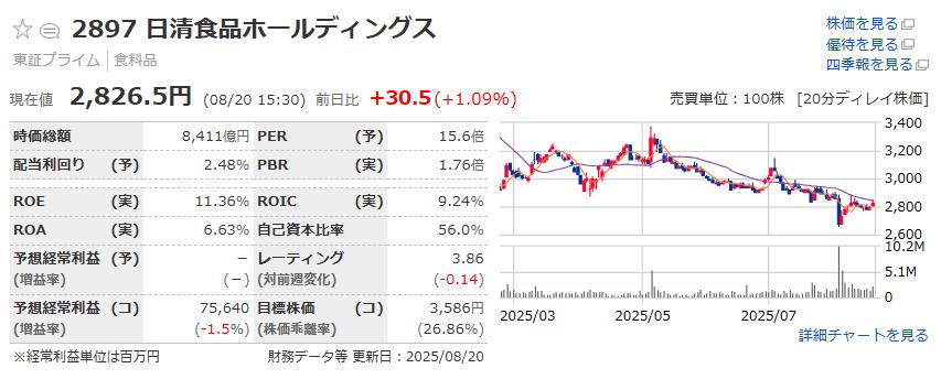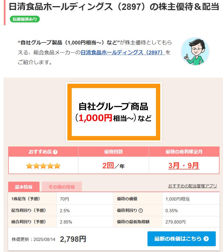 優待はおまけですが、日清食品の商品がもらえるようです。私はこういう地味な銘柄が好きです。
