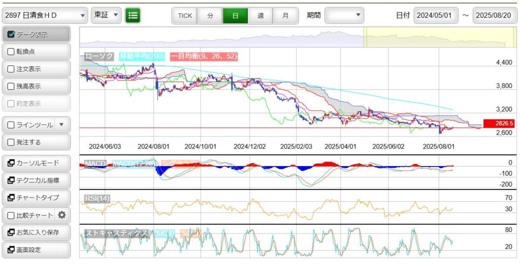 日清食品ホールディングス(2897)で言わずと知れたインスタントラーメンの会社です。株価は低迷しておりますが業績は回復してきており、買って長期投資する方針です。株というのは低迷しているときに買い、永久に保有できるのが一番いいと思います。さらにツナギでコストを下げていきます。ゆっくり行きたい銘柄です。