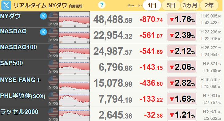 アメリカでトランプ大統領がグリーンランド絡みでまた関税を掛けると吠えて、株が下げている。もう見慣れた光景になっているが、しょうもないとしかいえない。日本株の先物も800円以上下げているので、今日は急落からスタートだろう。これは過熱感のあった日本市場にとっては、予定の下げともいえる。ツナギが今回もよい保険になっており、いつも通り少しづつ換金していきたい。こうやって買いコストが下げられるのがツナギ売買の良いところだ。どこまで下げるのかは分からないが、トランプの事なのでどこかで折れるだろう。あまり気にせず様子を見たい。日本の選挙だが、高市総理の支持率が7%下げているので、そんな大勝はしないのではないだろうか。過半数を割りながらも、地道に仕事をする姿に支持していたが、予算も放棄して解散して期待していた層が離れたのだろう。支持率が高いから解散したが、解散したことで支持が減るのは皮肉なものだ。どちらにせよ参議院は過半数無いのだから、政治状況はそんなに変わらないと思う。過熱した株は下がり、次の材料を探す展開になると思う。